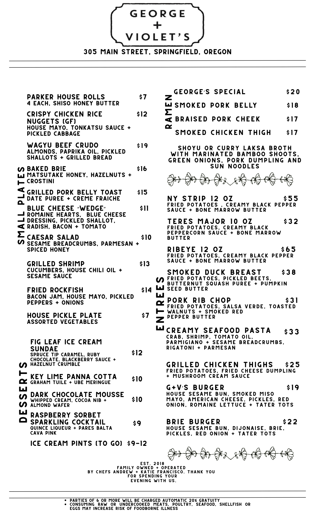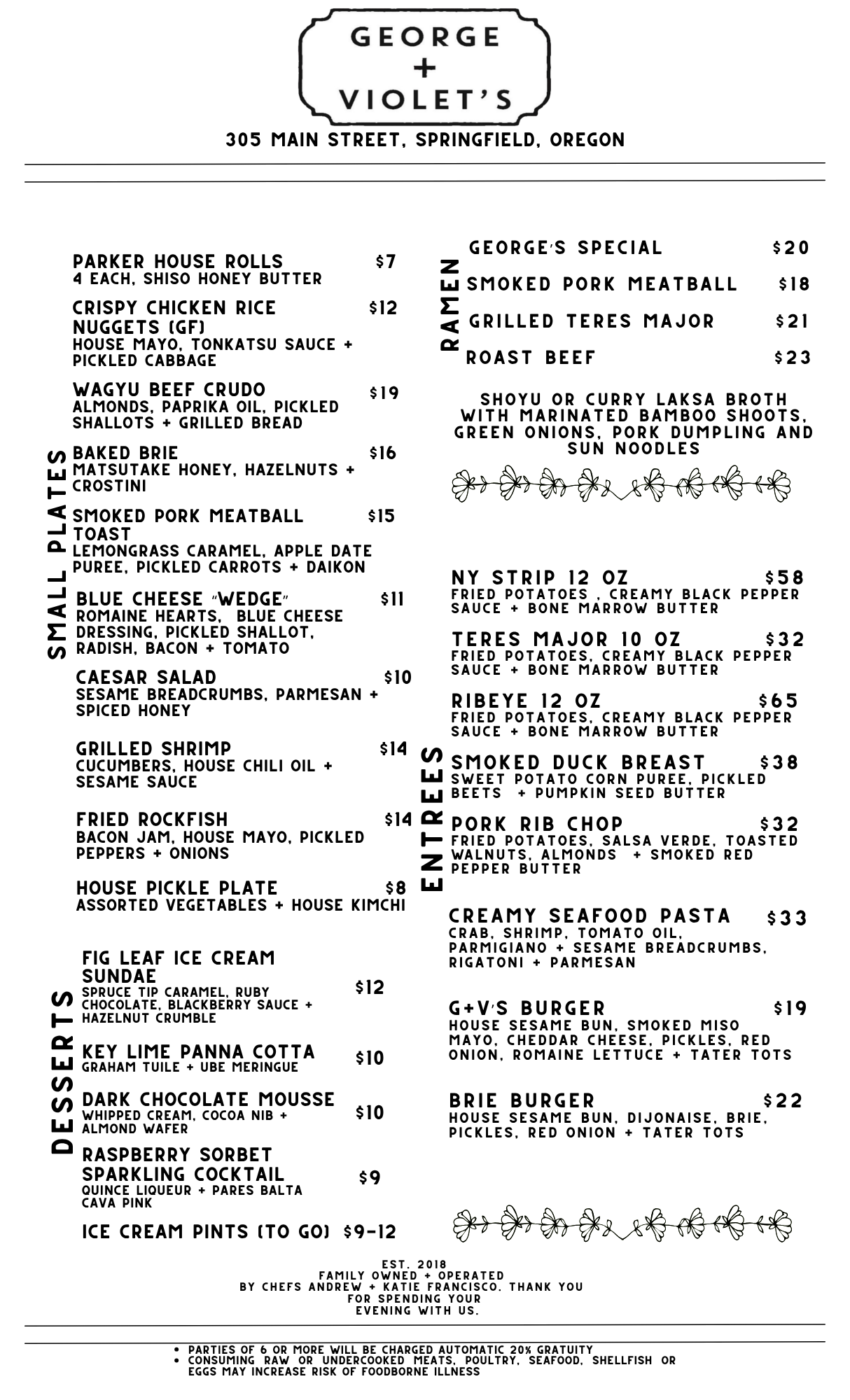 FAMILY OWNED + OPERATED BY CHEFS ANDREW + KATIE FRANCISCO. WE ARE COMMITTED TO SERVING OUR COMMUNITY BY OFFERING LOCALLY SOURCED GRASS FED BEEF, HUMANELY RAISED SUSTAINABLE PROTEINS + ORGANIC PRODUCE. WE CELEBRATE OUR LOVE + RESPECT FOR CUISINE WITH HOMEMADE CHARCUTERIE, AN IN HOUSE PASTRY + BREAD PROGRAM, + A THOUGHTFULLY CHOSEN WINE LIST. THANK YOU FOR SPENDING YOUR EVENING WITH US.